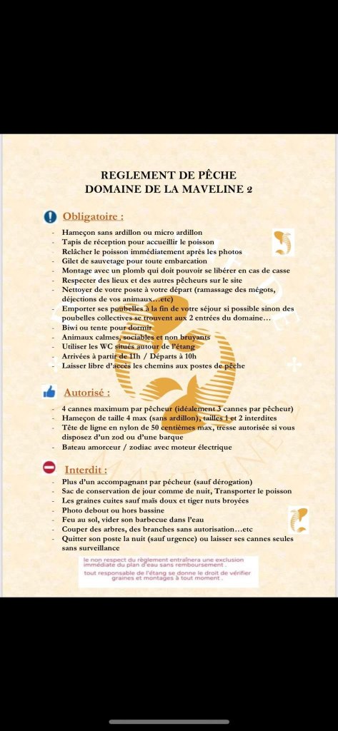 - Obligatoire : hameçons sans ardillon ou micro-ardillon, tapis de réception, relâcher immédiatement les poissons, gilet de sauvetage, montage plomb libre, propreté du poste, bivouac (biwi ou tente), arrivées à 11h / départs à 10h