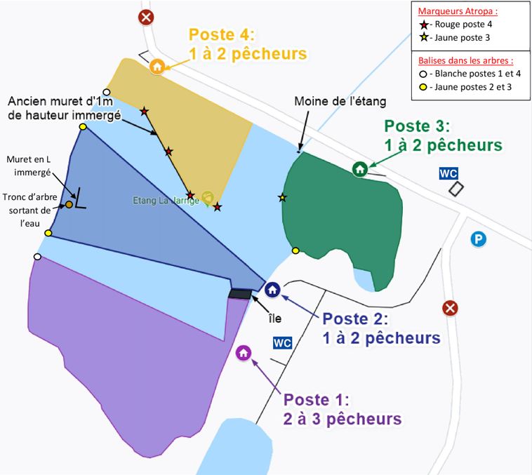 4 postes identifiés, chacun entourant l’étang dans des secteurs ombragés
