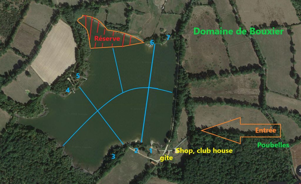 - 🌊 Surface : 21 ha d’eau (7 postes, 14 pêcheurs max)
